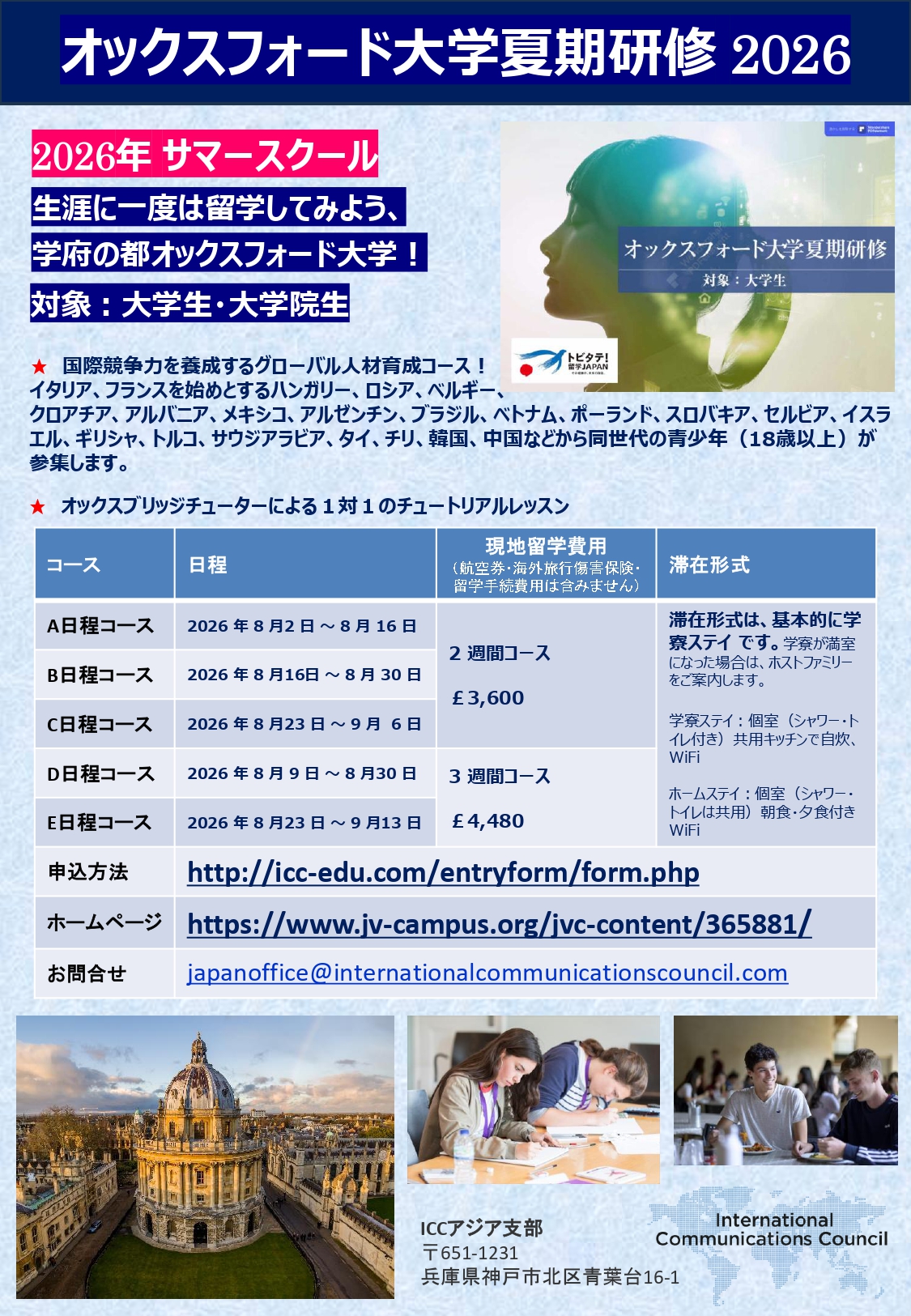WEB 申込:http://icc-edu.com/entryform/form.php 8月10日(月)オリエンテーション(パスポートおよび海外旅行傷害保険証のコピーを持参し、下記場所に参集してください。) 8:30-Oxford International Oxford 36-37 Pembroke Street, Oxford 1:45-Weston Lecture Theatre (front of Admissions Office) University of Oxford Bodleian Library, Broad Street, Oxford 申込期限:2026年7月9日(申込受付中!) |